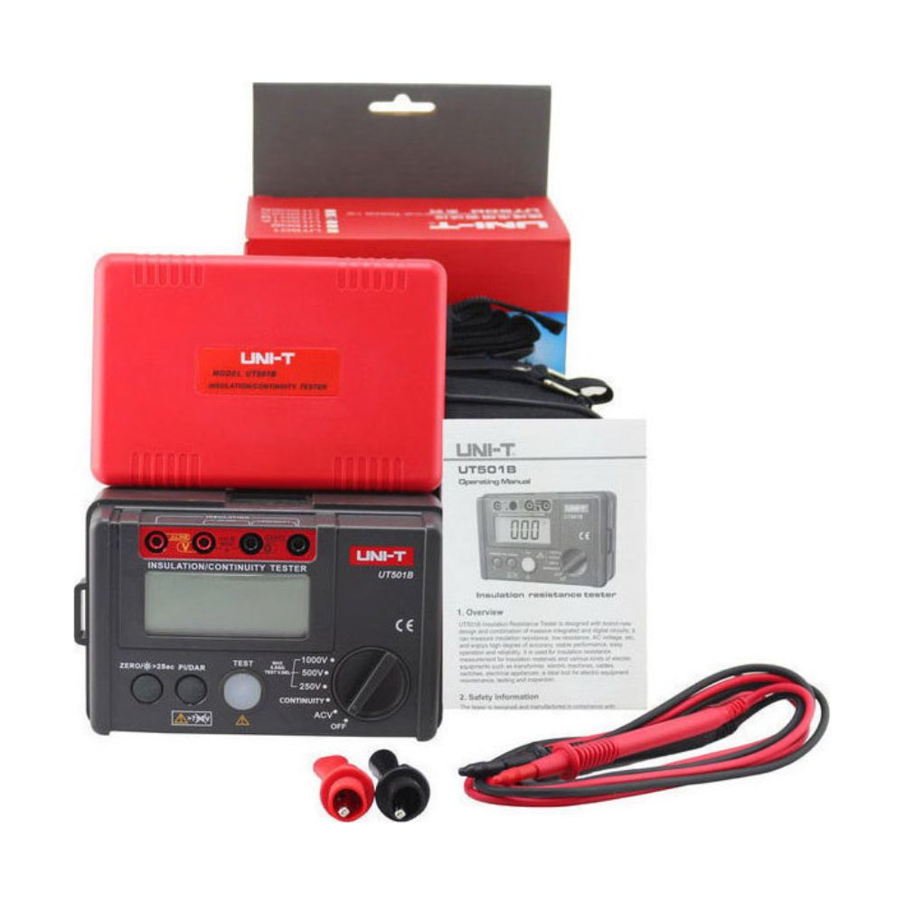 El megóhmetro digital UNI-T UT501B es un probador de resistencia de aislamiento digital diseñado para garantizar la seguridad y el correcto funcionamiento de instalaciones eléctricas, motores y transformadores. Con un rango de prueba de hasta 1000V, este equipo es la solución profesional para realizar pruebas de aceptación y mantenimiento preventivo de forma rápida y precisa.
