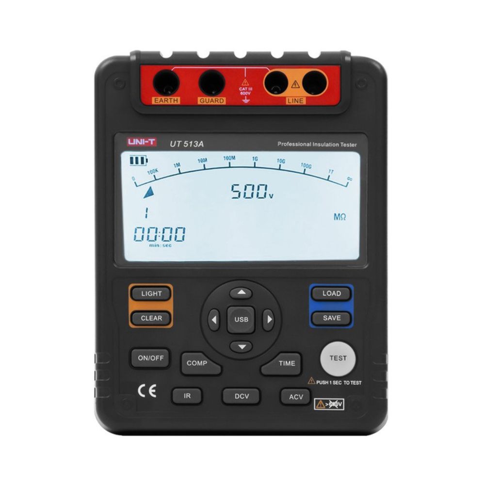 El megometro digital UNI-T UT513A mide la resistencia de aislamiento de transformadores grandes, generadores, motores de alta tensión y más. También miden PI, DAR y otras especificaciones importantes. Los datos medidos se pueden analizar mediante software para PC. El UT513A puede producir tensiones de prueba de hasta 5 kV.